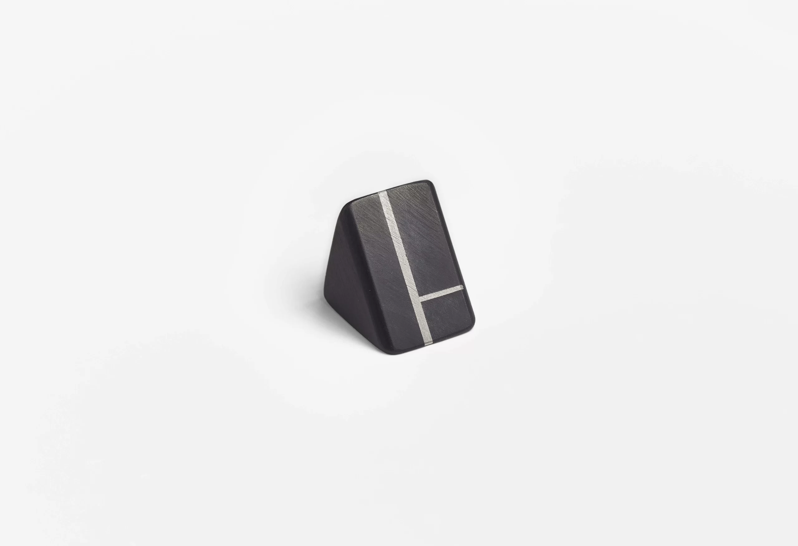 Anello realizzato da sezione di tubo quadro in ferro fiammato nero con inserti ad agemina in argento oppure oro. L’agemina è un’antichissa tecnica che prevede l’inserimento di fili o laminette di metalli diversi battuti a freddo e incastrati all’interno di solchi o incavi.