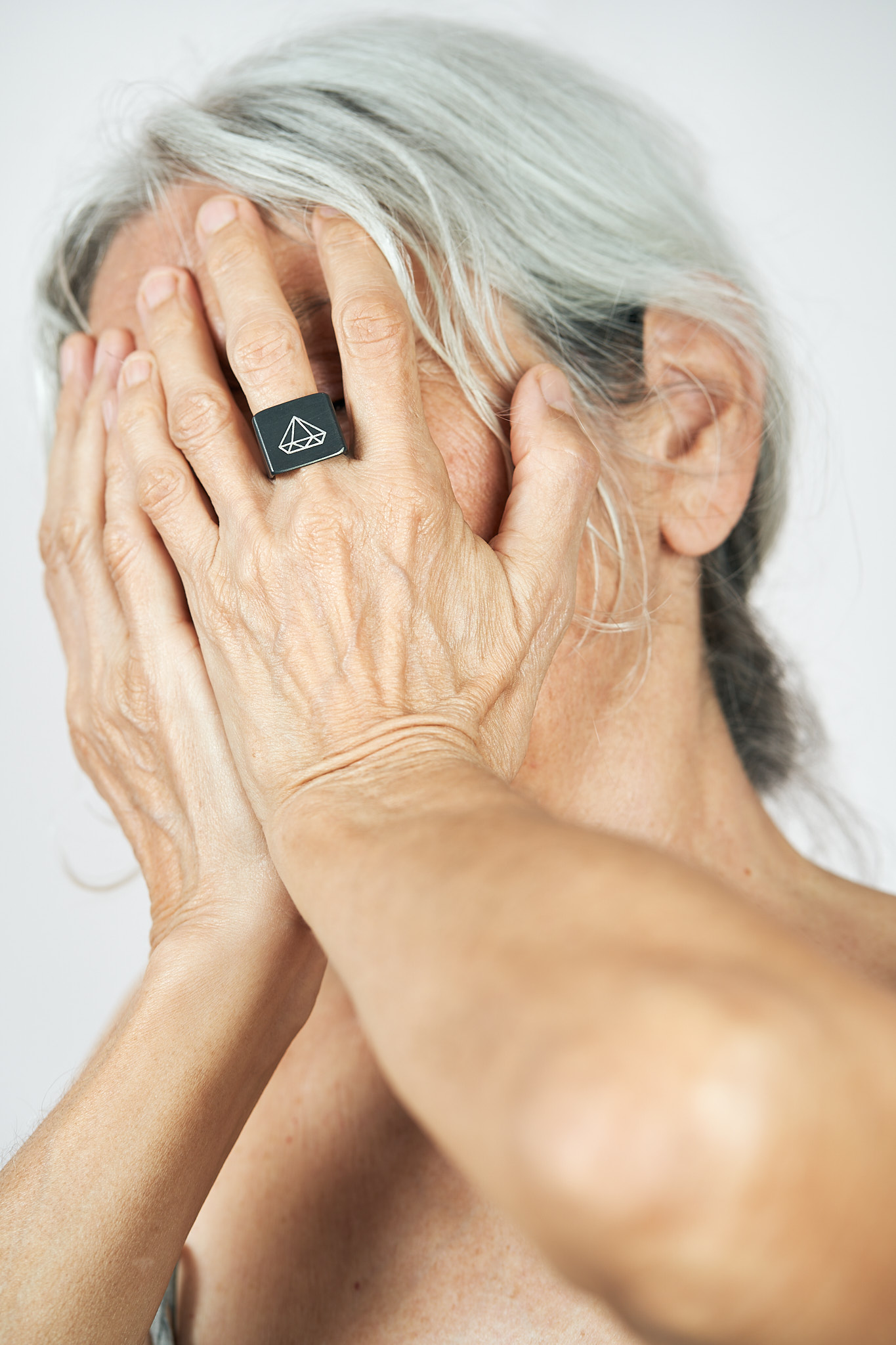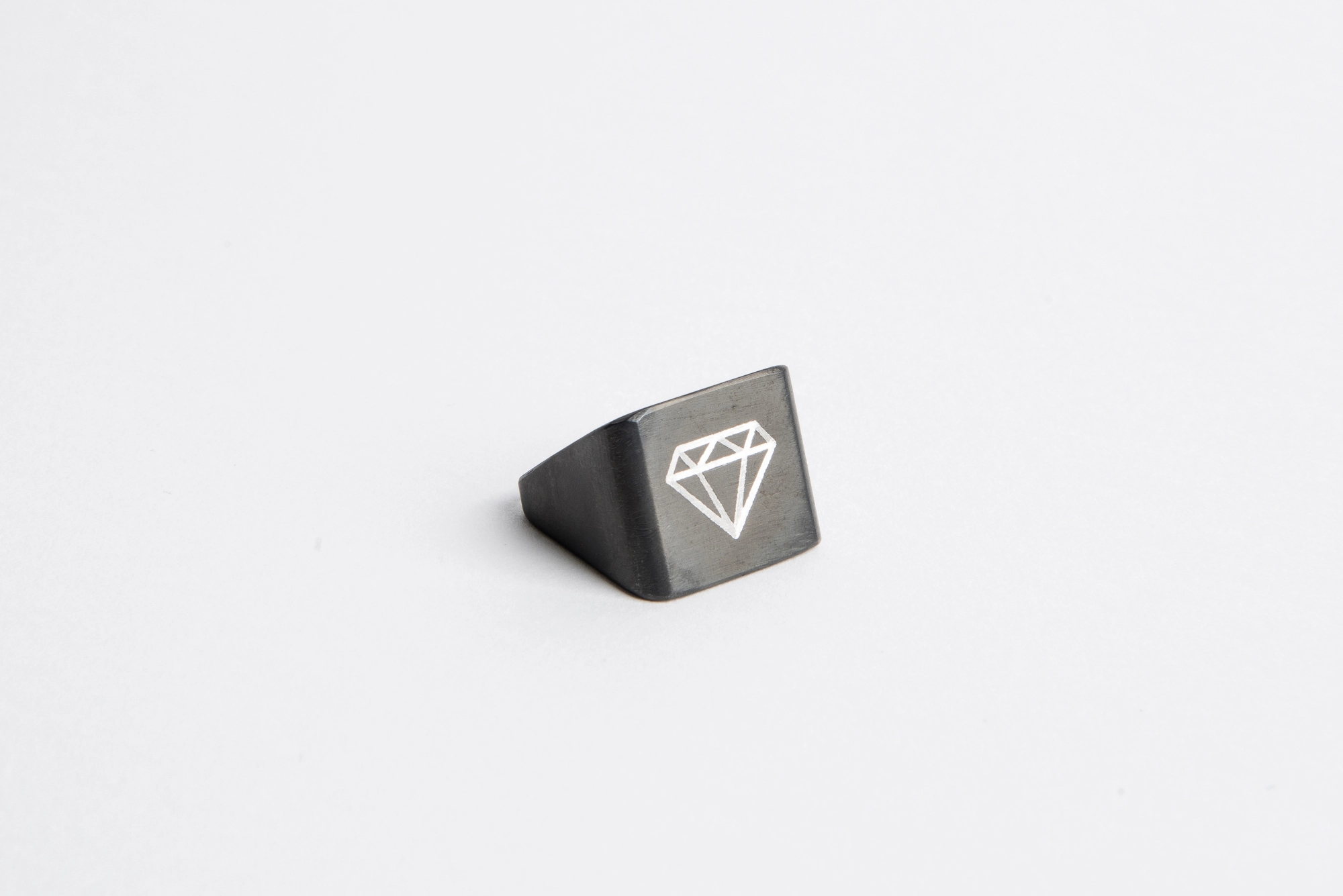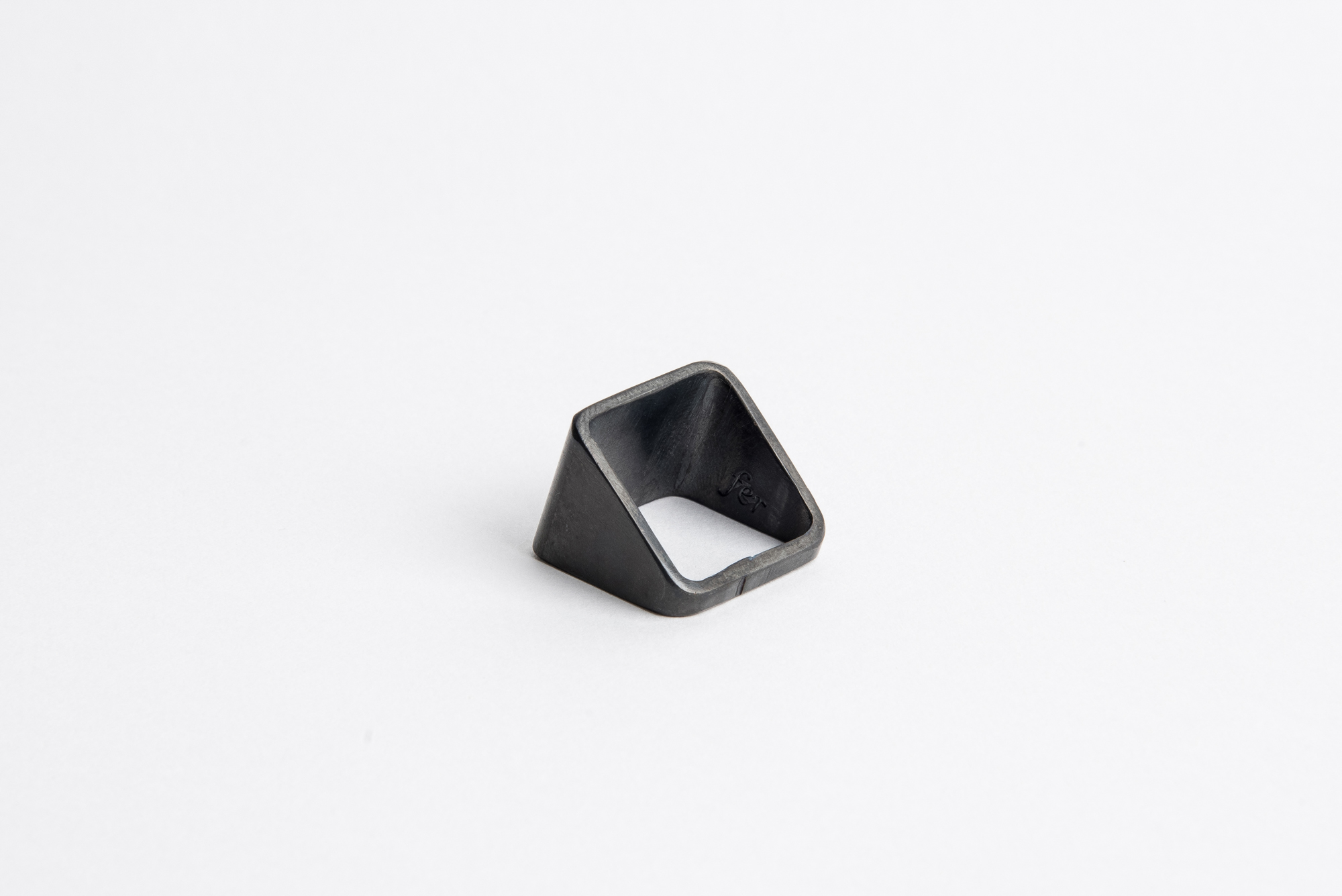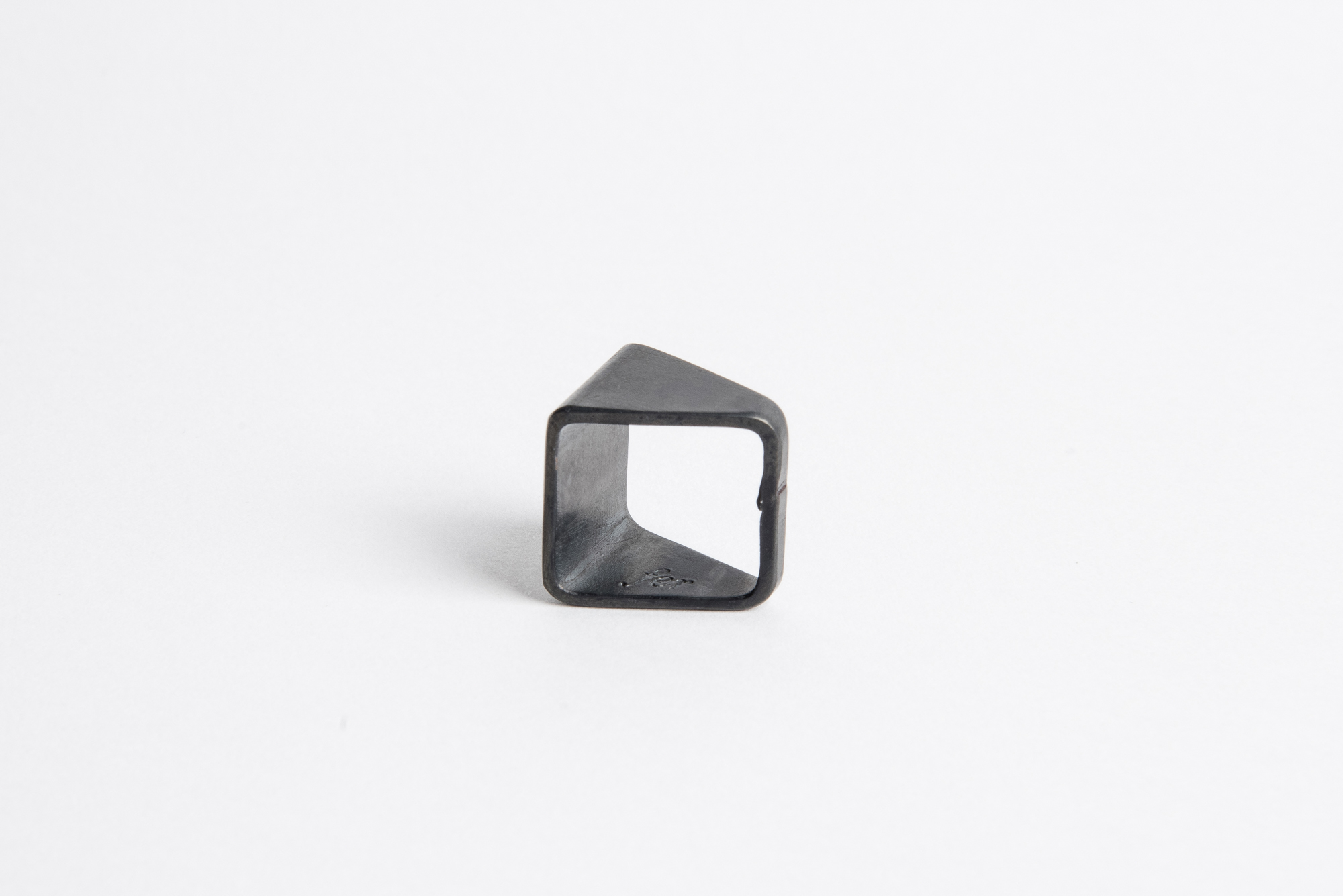 Anello realizzato da sezione di tubo quadro in ferro fiammato nero con inserti ad agemina in argento. L’agemina è un’antichissima tecnica che prevede l’inserimento di fili o laminette di metalli diversi battuti a freddo e incastrati all’interno di solchi o incavi.