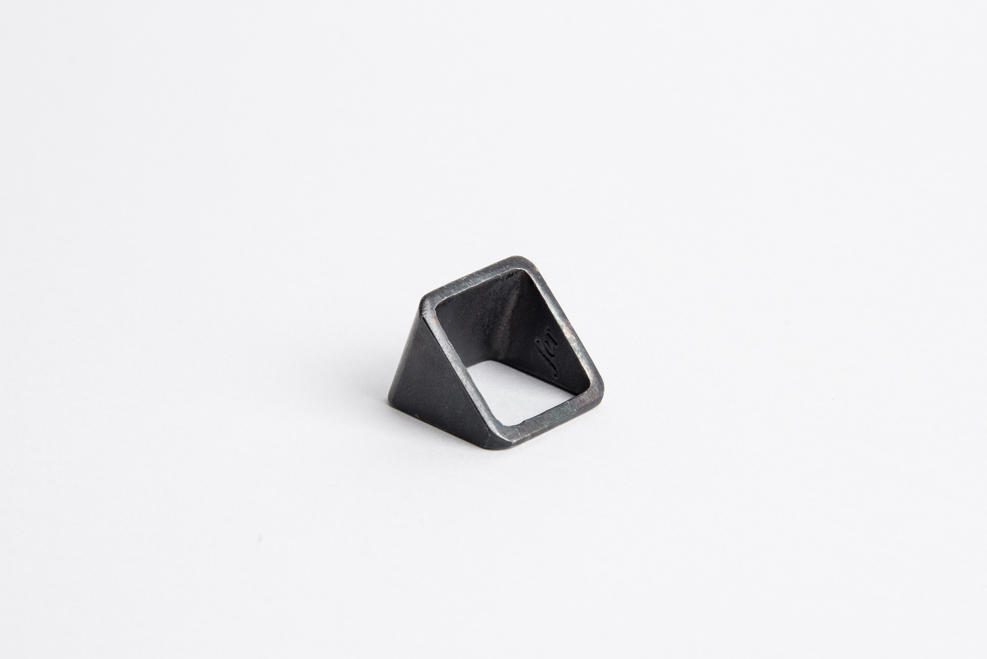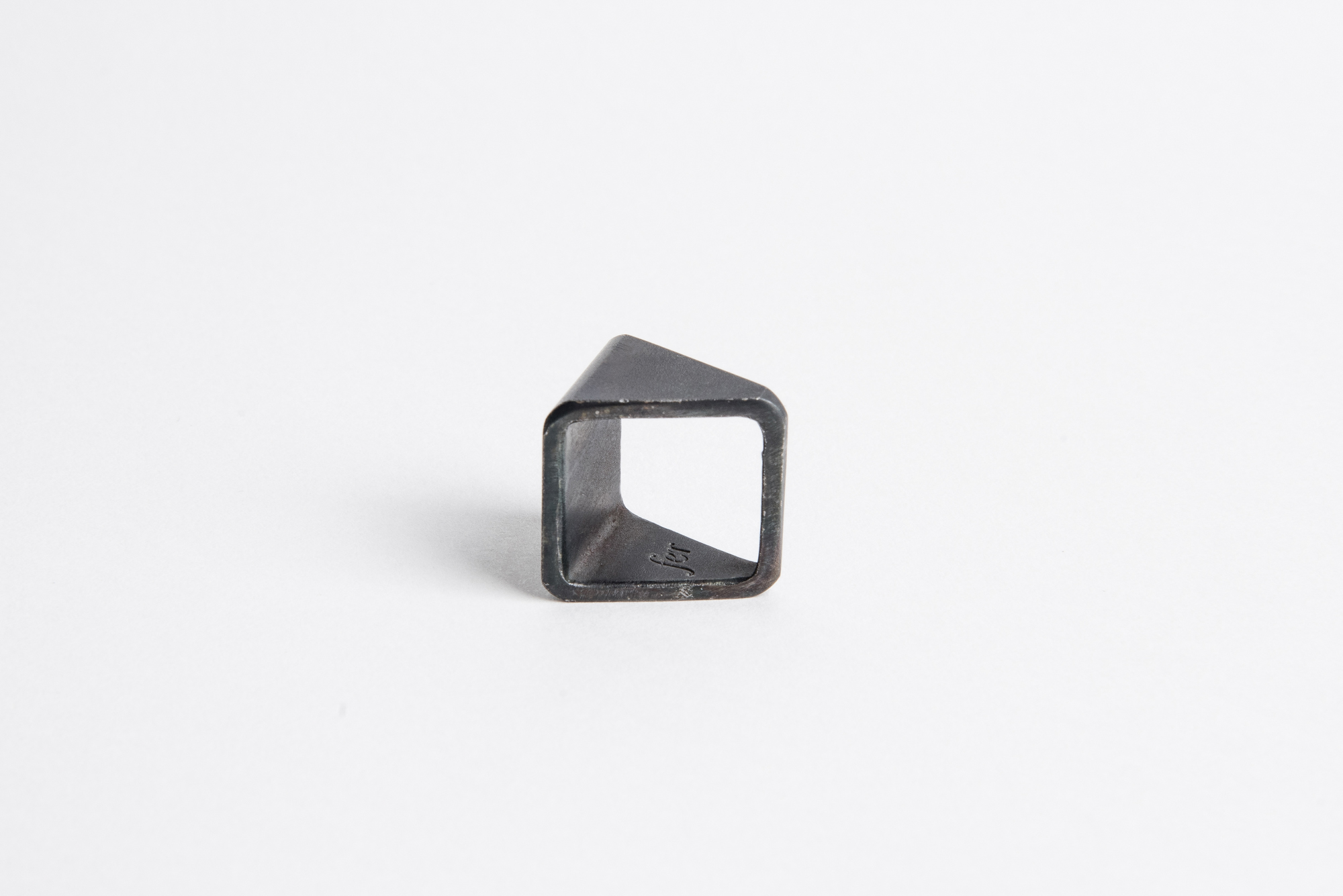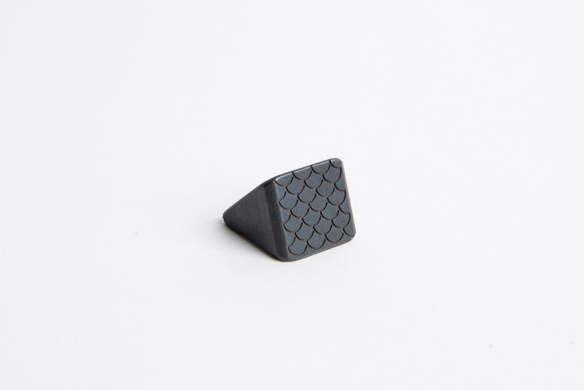 Anello realizzato da sezione di tubo quadro in ferro fiammato nero con texture incisa a pantografo che riproduce la pelle della carpa Koi.